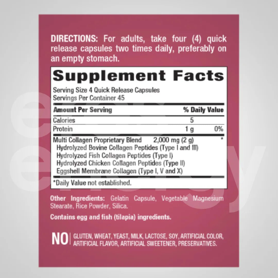 1 frasco con 180 cápsulas de multi colágeno 2000 mg marca piping rock.